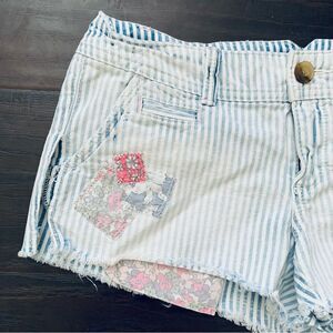 American Eagle AE White/Blue Striped w/Floral Patchwork Cut Off Jean Shorts | 2