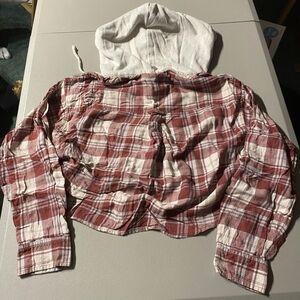 American Eagle AEO Red Plaid Hooded Cropped Flannel Shirt Women's Medium M Fall