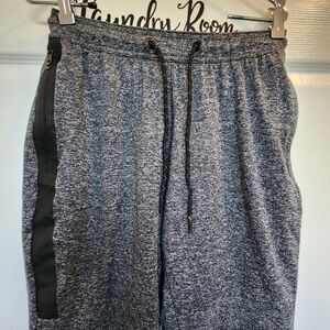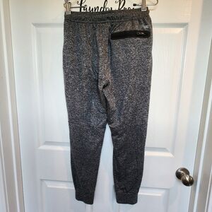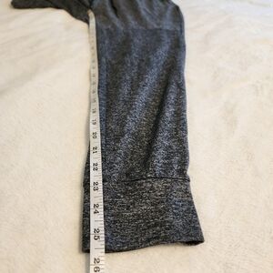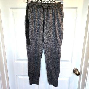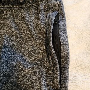 92% polyester, 8% elastane. 2 side zip pockets and 1 back zip pockets. Drawstring waist. AE logo on inside of waistband. Can be flipped outwards. Elasticated cuffs. Stretchy material. AE reflective logo on back has some peeling as shown. Heather gray with black detail. Women's Size Small Petite. Please compare measurements to something similar to ensure fit.