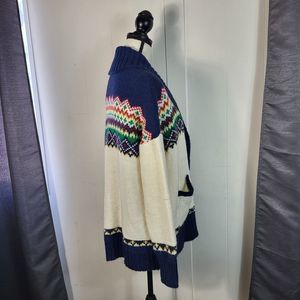 Super cozy and festive! This cardigan is mad up of a mohair, wool and aplca blend. Bright Nordic pattern on a cream back drop with 2 pockets. Relaxed lofty fit. EUC