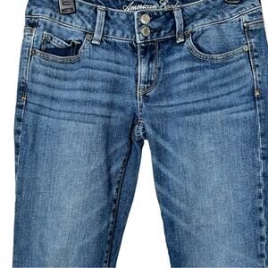 These American Eagle Artist Cropped Ankle Jeans in size 4 offer a stylish, feminine fit with a comfortable cotton-spandex blend. Featuring a classic medium blue wash and a flattering low-rise waist with double button detail, these jeans are perfect for casual or festival looks.