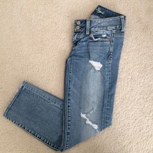 American Eagle Artist denim Jean. Size 00, stretch Jean, straight leg. In very good condition - barely worn. This destroyed denim Jean is perfect to wear with fall booties or wedges! Cropped fit*
