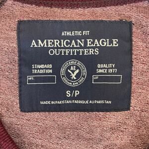 Score a sleek, well-loved American Eagle Outfitters athletic fit crewneck sweatshirt in a deep burgundy/maroon hue (size S/P). Crafted of a cozy cotton-poly blend (approx. 70% cotton, 30% polyester), and proudly labeled "made in Pakistan." This lightweight, athletically cut crew is machine-washable and free of rips or stains.