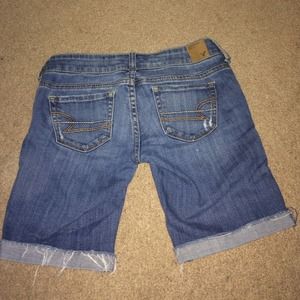 Size 00. Leg is rolled once with frayed edges. Small holes in thigh were in the design of the shorts, not from wear.