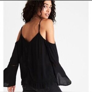 American Eagle Black Blue Floral Embroidery Cold Shoulder Blouse Top
