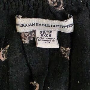 American Eagle Outfitters women’s crop top, size XS. Black with boho floral print, adjustable spaghetti straps, ruffle overlay, and smocked waist for a flattering fit. Lightweight cotton blend, perfect for layering with shorts or jeans.
