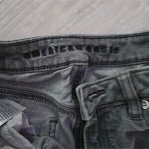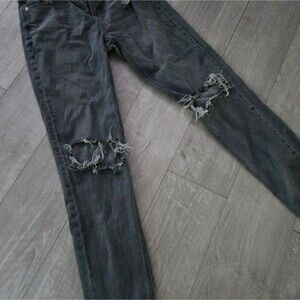 Edgy and trendy American Eagle jeans in a washed black/charcoal color. Features heavy distressing with shredded knees, ripped thigh details, and raw cut hems for that grunge streetwear vibe. High rise waist with a straight leg fit — perfect for pairing with crop tops, oversized hoodies, or boots.
