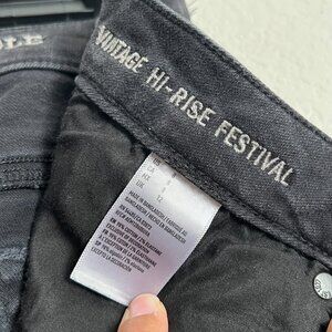 Vintage hi-rise festival shorts by American Eagle. Women's size 8. Stretch denim. Highly distressed with raw frayed hem. Zippered front with button. 5 pockets. In great used condition. Please see all pictures and measurements for reference.