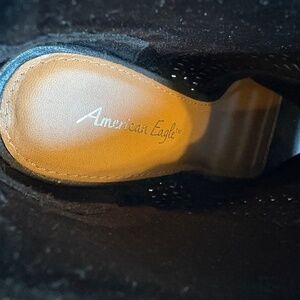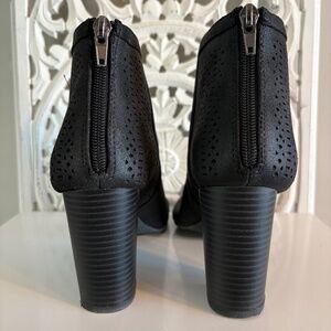 American Eagle Black Faux Suede Open Toe Bootie Lattice Pattern Chunky Heel