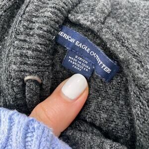 American Eagle Black Fuzzy Distressed Hoodie Size Small. Excellent condition, like new. Black/dark gray. Intentional rip/distressed detailing. Hooded sweater. Adjustable drawstrings in hood. Slightly cropped.
