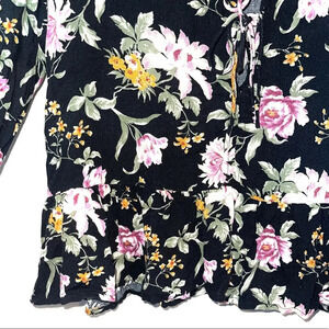 American Eagle black synthetic keyhole tie front floral top. In excellent condition! Deep V neckline. Two open keyholes on the front, which tie close. Long sleeves, which have a adjustable tie accents on the cuffs. Wide bottom hemline. Subtle ruffle along bottom. Black with bright pink, orange & green floral print. Size medium.