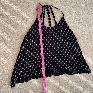 Brand: American Eagle. Black Tank Top with open back with Flower detail, Light flowy material, White repeating pattern printed on it, never worn, Great condition
