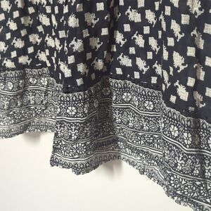 Black with gray and white sleeveless blouse. Contrasting prints. Cute tie at neckline.