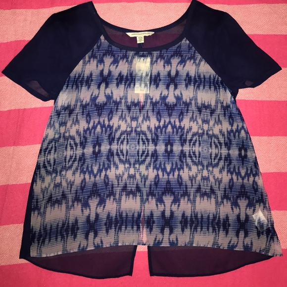 This American Eagle Top has never been worn! It still has attached tags! It is sheer (a bit see through; as seen in the picture of my hand under the fabric.) Size: XS. 100% Polyester.