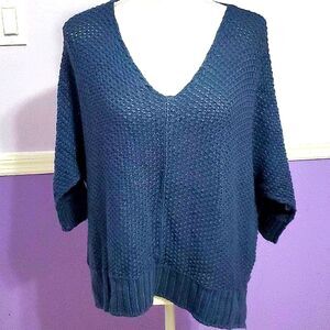 Blue gray oversized open knit sweater with a V-neck. 3/4 semi-bat sleeves. Ribbed knit on sleeves and bottom hem. High-low hem with side slits. Very soft material made of 100% acrylic.