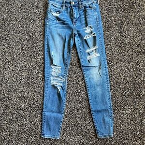 These American Eagle blue jeggings feature a trendy distressed design with frayed edges, offering a casual and worn-in look. The light blue wash and slim fit silhouette make them a versatile choice for everyday wear. Perfect for adding a touch of edge to your outfit.