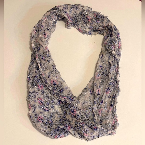 American Eagle brand lightweight scarf. So pretty! Infinity style. White with blue, pink, and metallic silver pattern. Frayed edges. A great pop to an outfit!