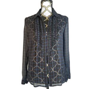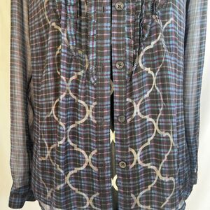 American Eagle Blue & Purple Plaid Sheer Button Front Ruffle Trim Top Size S/P