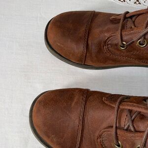 boho combat boots, festival boots, Aztec print lining, fold-over ankle boots, American Eagle Outfitters, brown faux leather boots, lace up moto boots, women’s size 8, vintage inspired, casual fall boots, Southwestern style