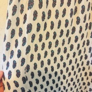 White maxi dress with blue all over design. Features flowing fabric across bust and open cut out on back. Also has one side split. Adjustable spaghetti straps and inner lining.