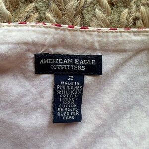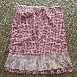 This American Eagle boho-inspired skirt features a beautiful red and white geometric print with a contrasting ruffle hem for a fun and feminine touch. Made from 100% cotton, it’s lightweight, breathable, and perfect for any season. Pair it with a simple tee or a cozy sweater for effortless style!