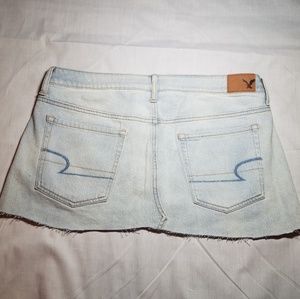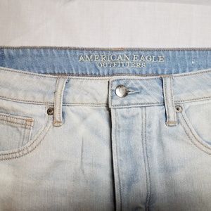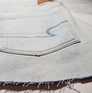Never worn. Light wash. Mid rise. Fraying at the bottom. Thinner denim. Would be perfect with a ripped and or cut up band t shirt and a chunky belt.