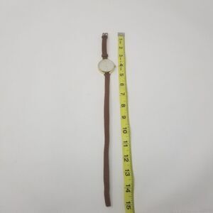 This American Eagle Brown Faux Leather Band and White Face Wraparound Watch is in good used condition. It has some slight discoloration on the back of the band and is untested and needs a battery. This wrap around watch has a long faux leather adjustable brown band and can be worn wrapped around the wrist several times or even as a choker necklace. This watch has a large round white face and a gold colored bezel, hands and indexes. The face of the watch has the American Eagle bird symbol, stick indexes and the hours 12 and 6 are marked with numbers. This trendy wrap around watch makes it look like you are wearing several bracelets and is a stylish accessory to add to any outfit.