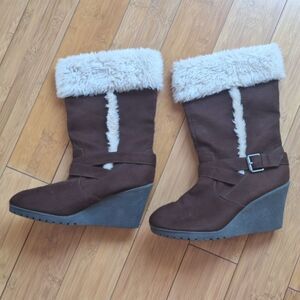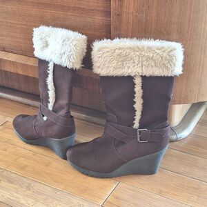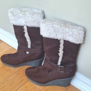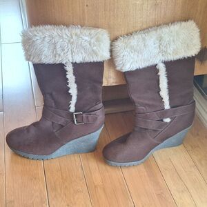 American Eagle AE Nola Wedge Fur Brown 13.5" Tall Boots with Faux Fur Trim Size 10
