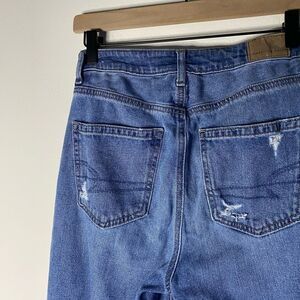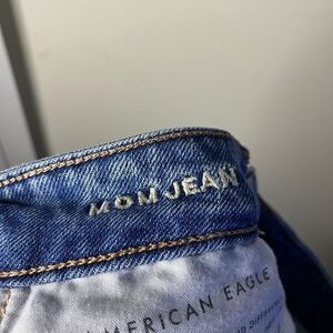 Mom jean from American Eagle. Busted knees and distressed details. High rise. Size 4. Approximate flat lay measurements- Waist: 13” across. Rise: 11”. Inseam: 27.5”. Generally preowned condition with no tears or stains.
