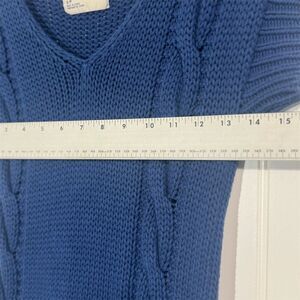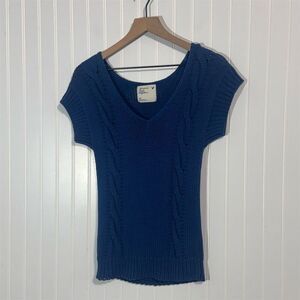 2009 American Eagle Outfitters short sleeve sweater top in a rich denim blue. Features a chunky cable knit pattern, wide ribbed cap sleeves, and V-neckline. Soft 100% cotton โ perfect for transitional layering or worn solo with jeans and boots. Tag size Small. Made in China.