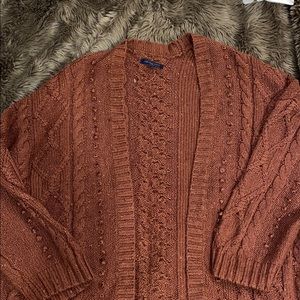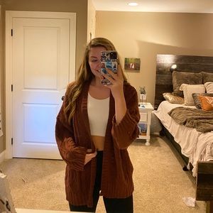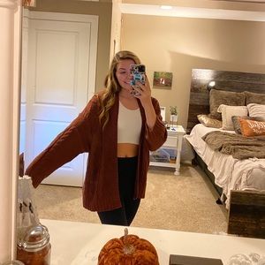 Super comfy! The size says XS/S but this can definitely fit a medium! The color is a burnt orange! So perfect for fall!