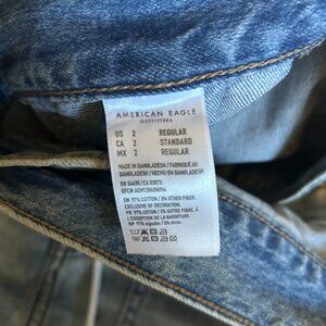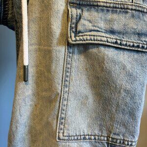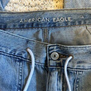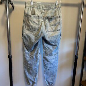 This is a pair of lightwash cargo style jogger jeans by American Eagle, size 2 Regular, featuring a zipper and button closure as well as a drawstring. There is some slight staining on the left knee (see photos). Otherwise great condition! All reasonable offers accepted!