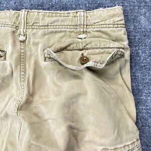 American Eagle Cargo Shorts Mens 28 Khaki longer length Raw Hem Distressed missing button back