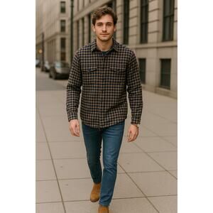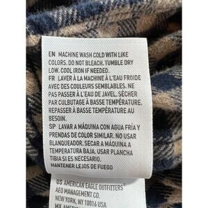 American Eagle Check Plaid Flannel Shirt Mens Size Large Button Up Navy Blue Tan