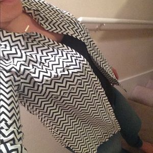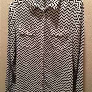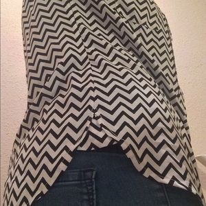 Adorable black and white chevron blouse. There is currently a button missing, but there are extra identical buttons...so one could easily be sewn into place. Cute side detail. Love this one! Made in India. 100% Polyester. Feel free to make an offer!