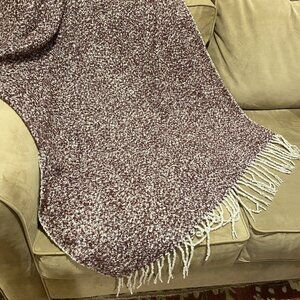 Soft and warm throw blanket with a stylish boucle texture. Features a burgundy and white color mix with decorative fringe on both ends.