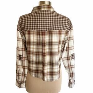 American Eagle Cozy Cabin Cropped Flannel Button Up SMALL Mixed Print Casual. Brown and cream plaid flannel. Elbows have distressed patches. Oversized fit. 60% cotton, 40% viscose. In excellent condition.
