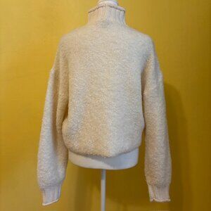 In like new condition. Soft, boucle textured cream-colored ribbed mock neck sweater. Ribbed cuffs. Dropped shoulders. Made of 50% recycled polyester, 29% acrylic, 9% polyester, 9% wool, 3% elastane. Machine washable.