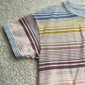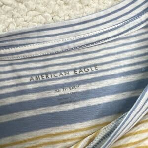 American Eagle Crop Tie Front Stripe Tee XS NWT. Brand new with tags still attached. Top is cropped with ties at bottom on front, striped with yellow, blue, red and a light pink. Approx measurements in photos.