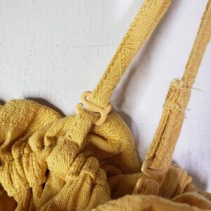 Key features: mustard gold, textured gauze like fabric, removeable spaghetti straps, built in tube top liner, elastic top