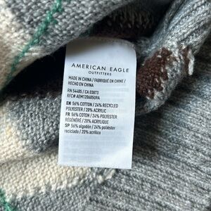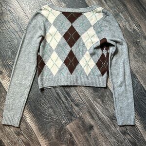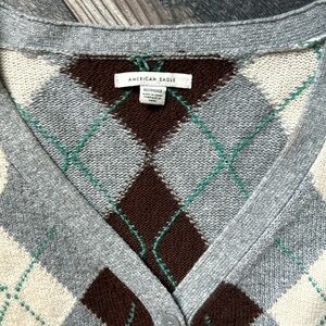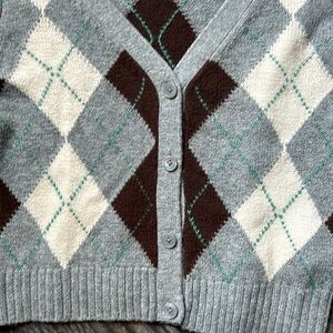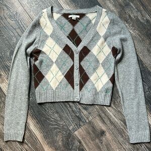 Argyle gray, brown, white and green cropped cardigan by American Eagle. Four working buttons on front for an open or closed look. Super soft! Measures 17.5” from top to bottom and 17.5” from pit to pit. Sleeve measures 18.5” from under pit to edge