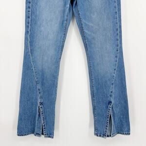 Holds its shape & won't bag out. These light blue jeans feature a high-waisted design with a flared silhouette that widens from the knee down. The full-length style reaches the ankle and includes a unique split detail at the hem for added flair. 100% cotton. Size 4. Excellent used condition. No flaws detected. See measurements for proper fit.