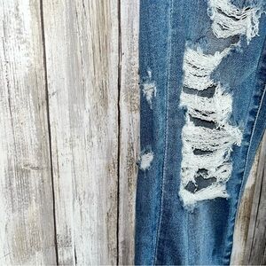 Stylish distressed blue jeans perfect for a casual look. Comfortable and trendy, these jeans are a must-have for your wardrobe.