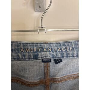 American Eagle AE Stretch Curvy Ripped Straight Jean in Light Destroy Wash with distressed detailing and ripped knees. Features a curvy fit with 13" hip-to-waist differential, high rise (9 3/4"), and Limitless Waistband technology for comfort. Crafted from 54% Cotton, 24% Tencel, 20% Recycled Cotton, 2% Elastane with stretch. Good pre-owned condition.