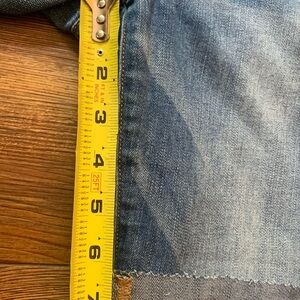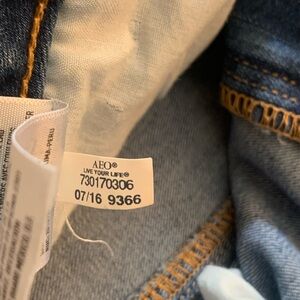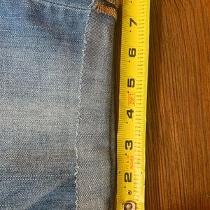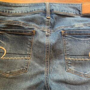 These American Eagle cut-off jegging shorts in size 10 feature a mid-rise and rolled cuff for a unique repurposed look. The blue color and 7-inch inseam make them a stylish and trendy choice for women looking to add a touch of personality to their wardrobe. With the American Eagle brand known for quality and style, these shorts are sure to be a versatile and fashionable addition to any collection. These altered jeggings have new life as a Bermuda style rolled cuff short, please see photos for condition and measurements.