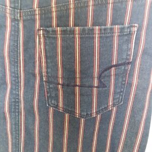 American Eagle Outfitters Super Stretch five pocket dark wash denim with red and white stripes high rise high waist mini skirt with zip fly and button closure and a raw frayed hem