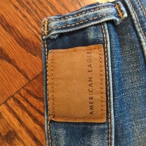 These blue jean shorts from American Eagle Outfitters feature a medium wash denim with stylish distressing for a vintage look. The shortie length and rolled-up cuffs add a casual flair, making them perfect for everyday wear.