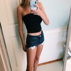 Dark denim cutoff shorts from AEO with lace pocket detail.