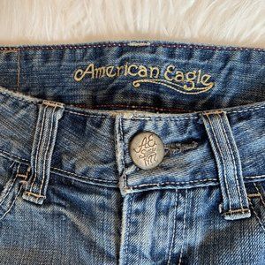 This distressed denim jean skirt from American Eagle is very comfortable and cute! Great condition (it's supposed to look distressed!).