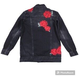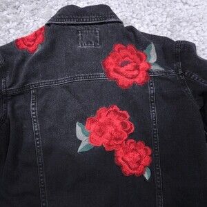 American Eagle Denim Jacket Oversized Embroidered Floral Rose Black Red Size XS